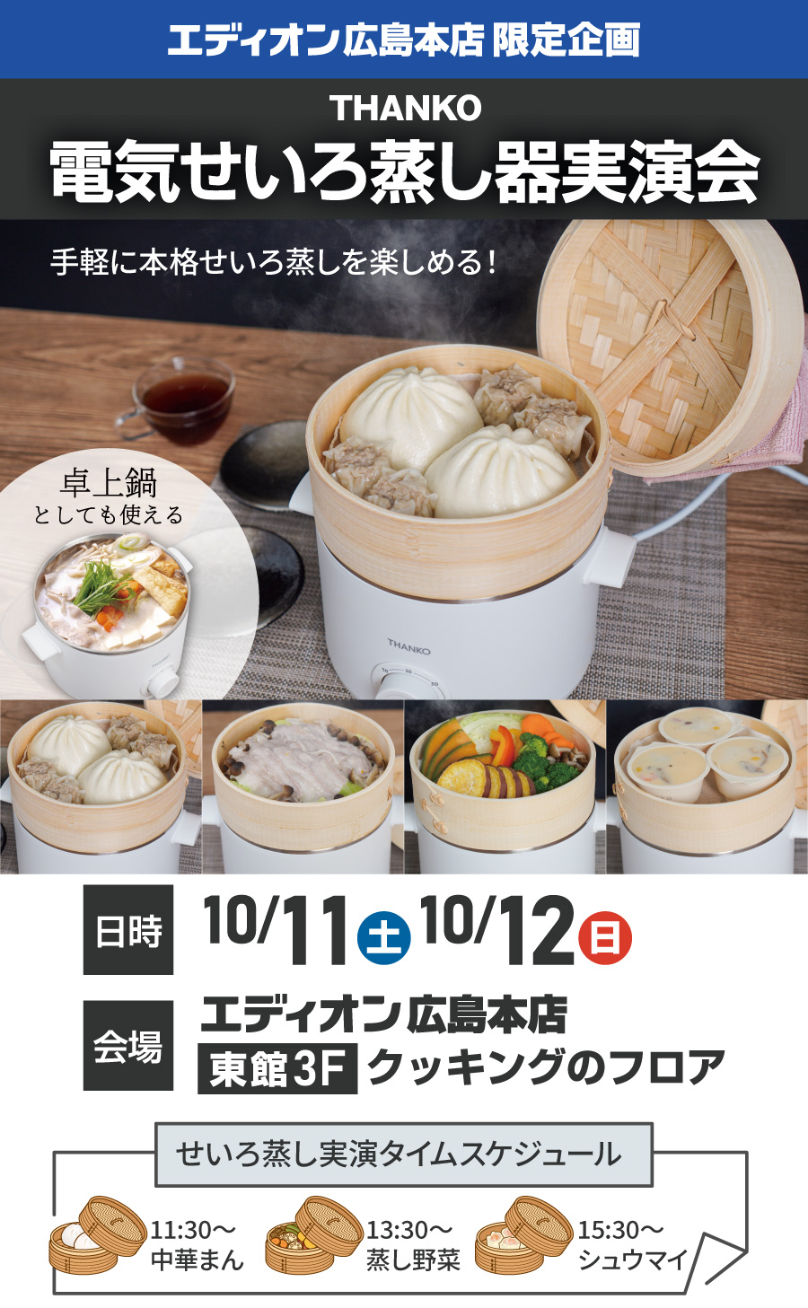 Language 日本語 English 簡体中文 繁体中文 CLOSE MENU HOMEホーム FLOORフロアガイド EVENTイベント SALEセール ACCESSアクセス NEWSニュース SERVICEサービス CONTACTお問い合わせ CLOSE Language 日本語 English 簡体中文 繁体中文 ホーム イベント サンコー「電気せいろ蒸し器実演会」