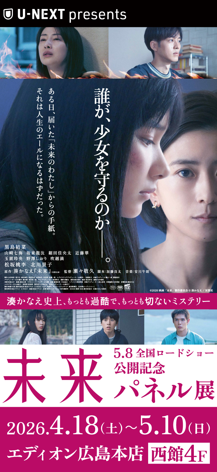 複雑な過去を抱えながら子どもたちに寄り添おうとする教師・真唯子を演じるのは、黒島結菜。章子には、『渇水』で注目された新星・山﨑七海。章子の心優しい父親には松坂桃李、衝撃的な秘密を抱え、世の中と距離を置く母親に北川景子。日本のエンターテインメントの最前線を走り続ける二人が、物語の核心に関わる重要な役どころとして登場する。さらに、坂東龍太、細田佳央太、近藤華ら若手実力派が集結し、人間という存在の明と暗を鮮やかに表現する。