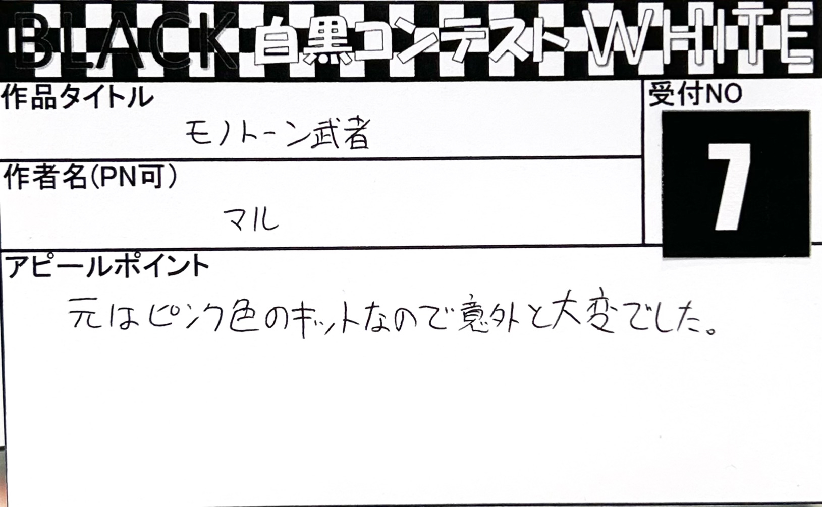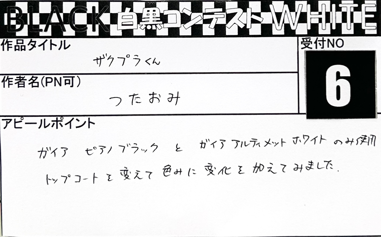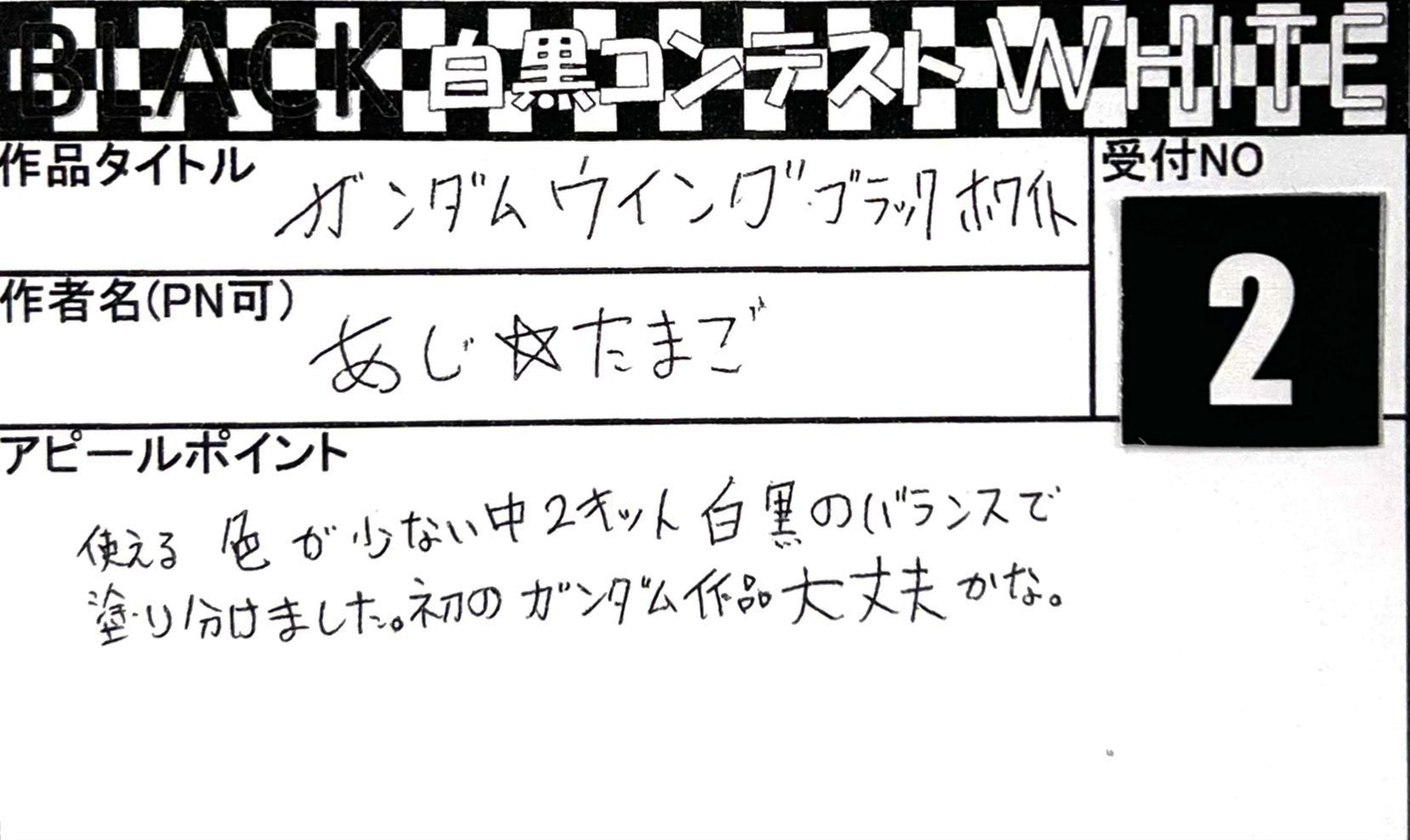 Language 日本語 English 簡体中文 繁体中文 CLOSE MENU HOMEホーム FLOORフロアガイド EVENTイベント SALEセール ACCESSアクセス NEWSニュース SERVICEサービス CONTACTお問い合わせ CLOSE Language 日本語 English 簡体中文 繁体中文 ホーム イベント BLACK & WHITE「白黒コンテスト」 応募作品 エントリーNO.8 トニー様 2026年/05体目 エントリーNO.7 マル様 モノトーン武者 エントリーNO.6 つたおみ様 ザクプラくん エントリーNO.5 しおん様 とても深い闇 エントリーNO.4 hito様 MODEROID ティタノマキア PANHEAD エントリーNO.3 ティケ様 ∀ガンダム エントリーNO.2 あじ☆たまご様 ガンダムウイングブラックホワイト エントリーNO.1 なべを様 HG 1/144 キュベレイダムド