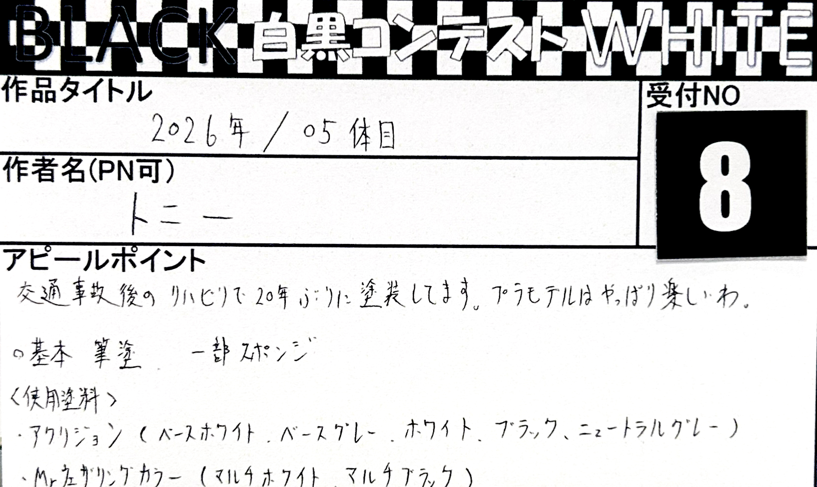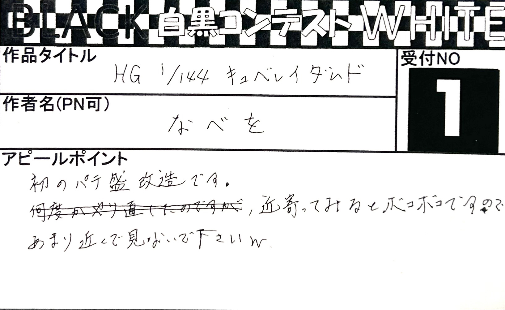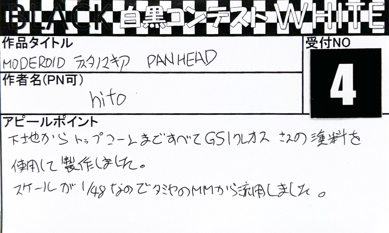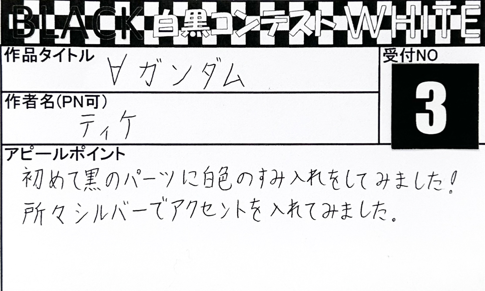 Language 日本語 English 簡体中文 繁体中文 CLOSE MENU HOMEホーム FLOORフロアガイド EVENTイベント SALEセール ACCESSアクセス NEWSニュース SERVICEサービス CONTACTお問い合わせ CLOSE Language 日本語 English 簡体中文 繁体中文 ホーム イベント BLACK & WHITE「白黒コンテスト」 応募作品 エントリーNO.8 トニー様 2026年/05体目 エントリーNO.7 マル様 モノトーン武者 エントリーNO.6 つたおみ様 ザクプラくん エントリーNO.5 しおん様 とても深い闇 エントリーNO.4 hito様 MODEROID ティタノマキア PANHEAD エントリーNO.3 ティケ様 ∀ガンダム エントリーNO.2 あじ☆たまご様 ガンダムウイングブラックホワイト エントリーNO.1 なべを様 HG 1/144 キュベレイダムド